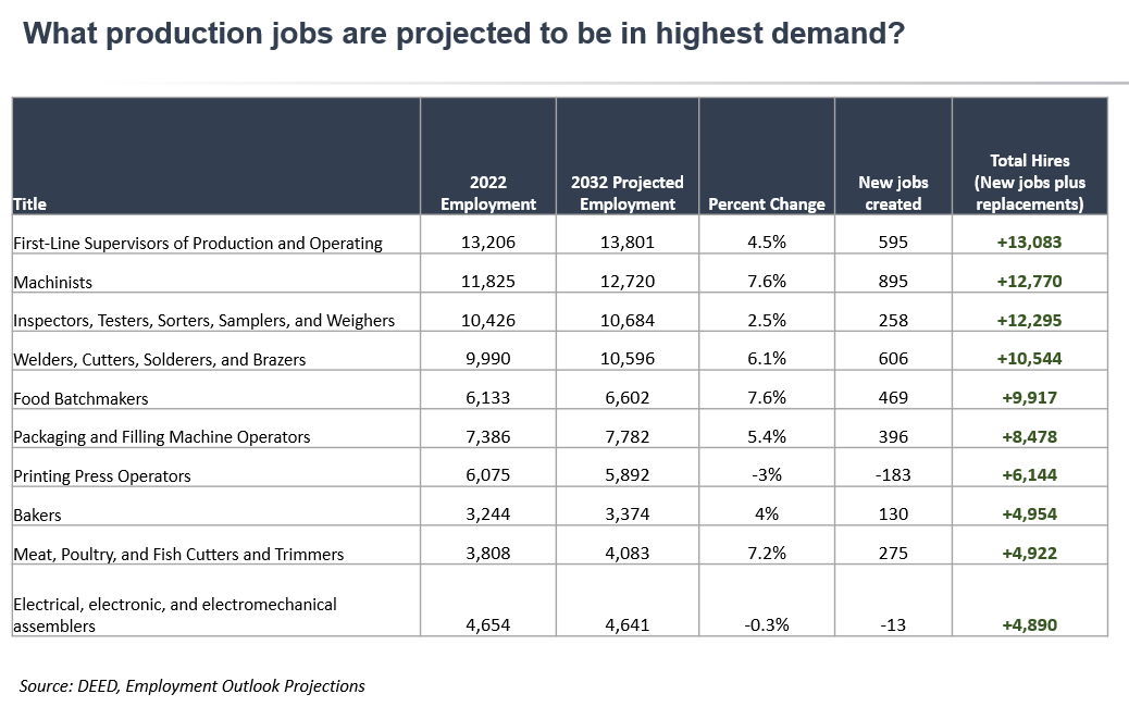 Second, demographic changes will generate significant replacement demand. Minnesota’s aging workforce means that many experienced production workers will retire over the coming years. The Department of Employment and Economic Development projects nearly 226,000 openings in production roles over the 2022–2032 period. The largest volumes are expected for production supervisors, machinists, inspectors and welders. Even occupations with declining overall employment—such as printing press operators—will still need substantial levels of backfilling to maintain operations.