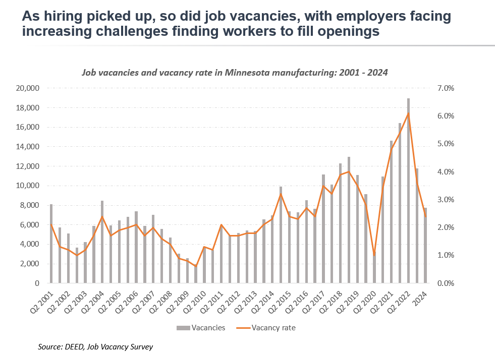 Minnesota’s manufacturing workforce remains one of the state’s most important competitive advantages. When manufacturers choose to locate or expand in Minnesota, they frequently cite access to a skilled workforce as a key driver of that decision. At the same time, however, workforce availability has emerged as one of the sector’s most significant constraints. Job vacancy data and employer feedback consistently show that difficulty filling open positions are among the most commonly reported barriers to growth across the state.
