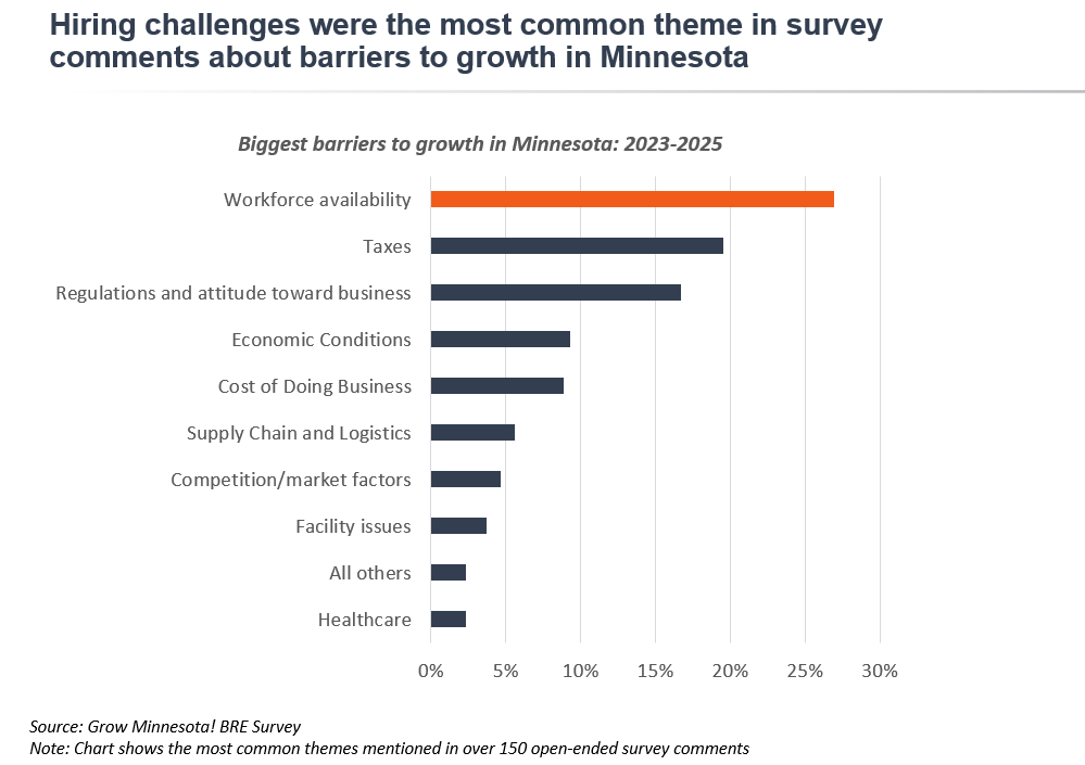 These hiring difficulties are more than a minor hurdle. Indeed, workforce availability topped the list of barriers to growth reported by Minnesota manufacturers in recent years. Interestingly, workforce challenges continued to rank among manufacturers top concerns in 2024 and 2025, even as hiring demand cooled in the face of sectoral headwinds. This demonstrates that the availability of qualified talent is perceived as a longer-term structural concern for manufacturing businesses in Minnesota.