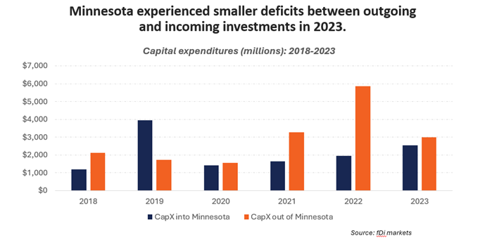 - Interest rates and inflation placed a burden on investments, causing some companies to delay expansion until the cost of borrowing decreases. Larger economic conditions are stifling growth; however, expansion data reveals an underlying demand for growth. In 2023, Minnesota had at least 113 expansion projects, up from 93 in 2022. Furthermore, investments into Minnesota from out-of-state companies increased to $2.5 billion in capital expenditures and 4,353 jobs created. Minnesota secured large investments across a range of industries including healthcare and medical technology, food and agriculture, data centers and advanced manufacturing.