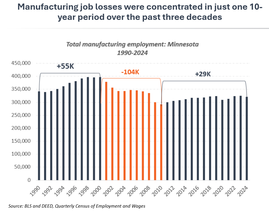 Minnesota’s manufacturing employment has declined over time. However, these losses were concentrated in a 10-year period between 2000-2010, with the state adding manufacturing jobs in two of the past three decades. The narrative of “manufacturing decline” – which dominates much of the public discourse on manufacturing – suggests that the sector has been in a state of steady losses over a period of decades. At first glance, this can look to be the case. Manufacturing jobs as a share of total employment in Minnesota fell from 15% in 2000 to 11% in 2024, without any significant period of market share gains in that time. However, this masks the extent to which job losses were concentrated in the decade between 2000 and 2010. This decade was marked by two recessions with severe impacts on manufacturing, alongside China’s accession to the World Trade Organization (WTO), which intensified global competition and offshoring pressures in what became known as the “China shock.”