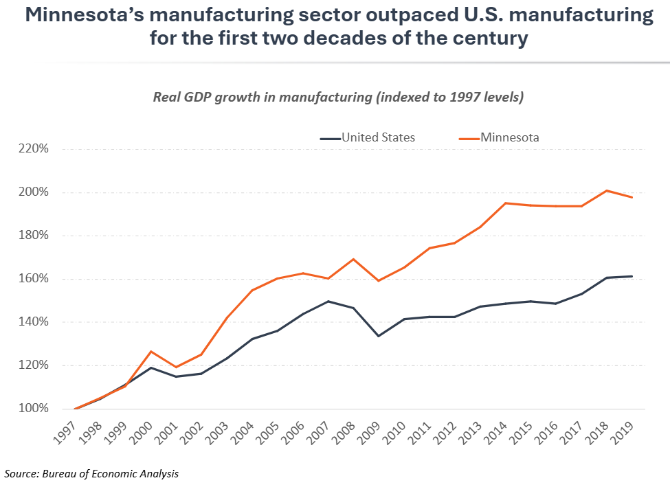 Manufacturing was a competitive bright spot for Minnesota in the first two decades of the century, with Minnesota outpacing the U.S. manufacturing sector and ranking 6th in GDP growth nationally from 2007-2019. While Minnesota’s overall economic growth consistently lagged the U.S. economy for much of this century, the opposite has been true for Minnesota’s manufacturing sector. From 2000-2019, Minnesota’s manufacturing GDP grew 2.4% annually, compared to just 1.6% in the U.S manufacturing sector. During the 2007-2019 business cycle, Minnesota ranked 6th among states in manufacturing GDP growth and ranked 1st among all states in the Midwest region.