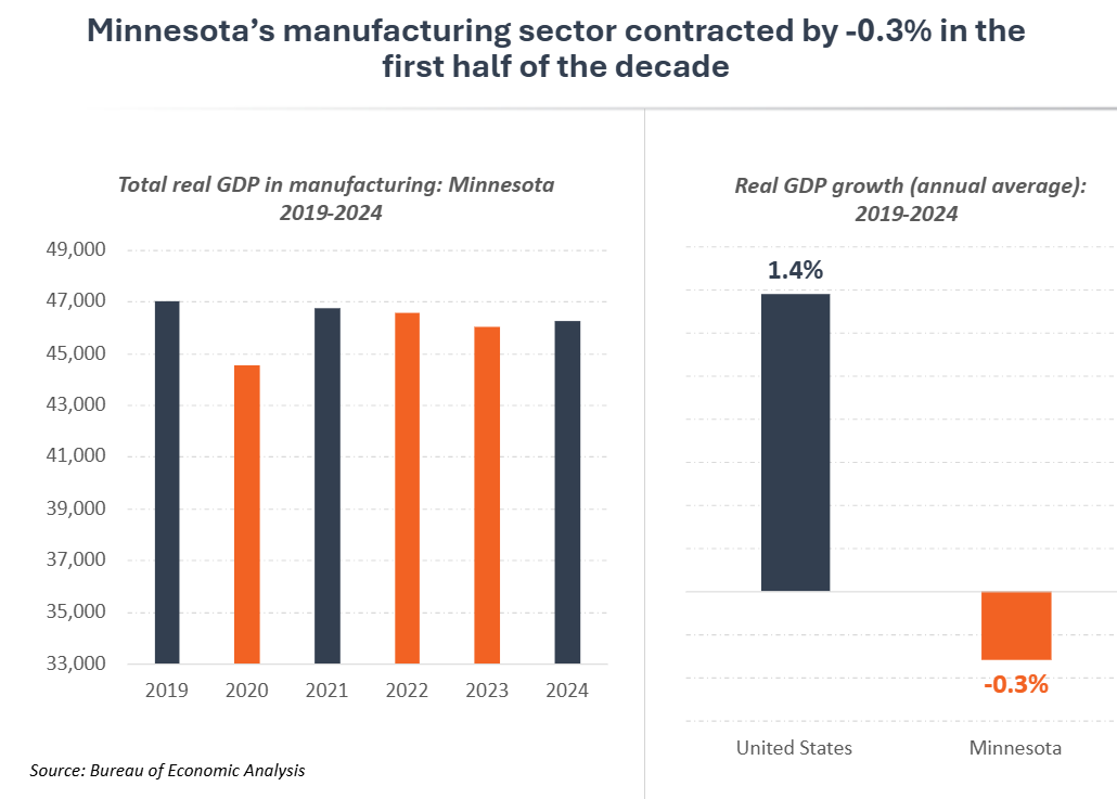 However, momentum has faltered in the first half of the current decade. Both manufacturing GDP and jobs have declined, and Minnesota now ranks 44th among states in manufacturing growth. This downturn has been a key factor in the state’s recent economic underperformance, with Minnesota falling into the lower third of states on several major growth indicators.