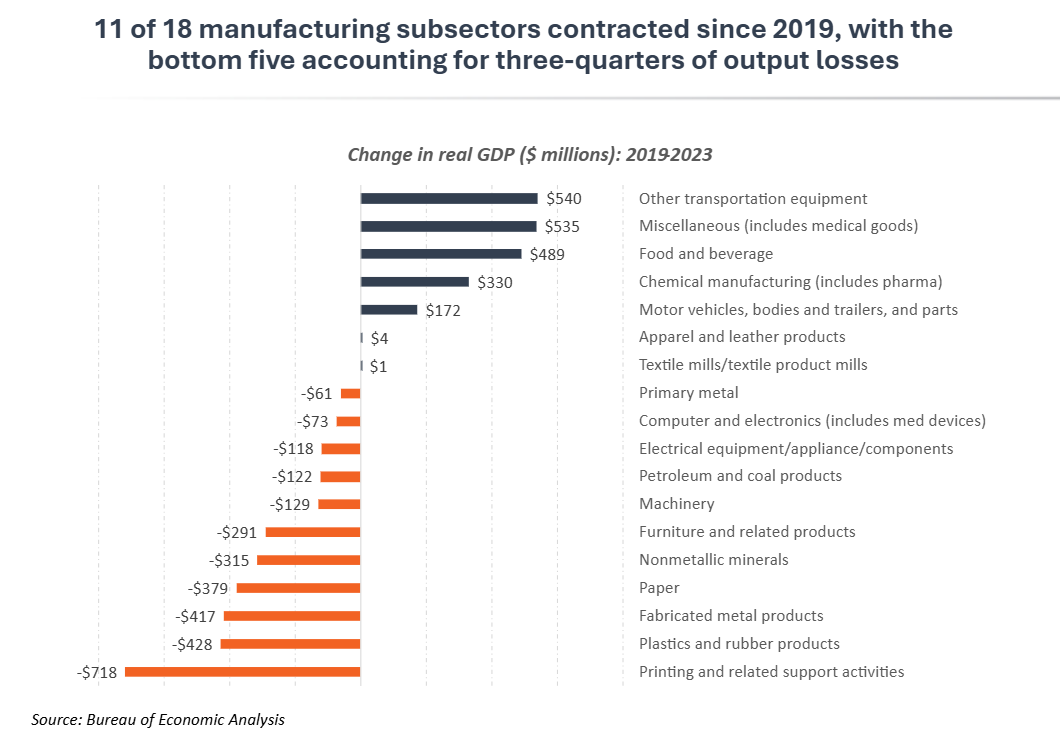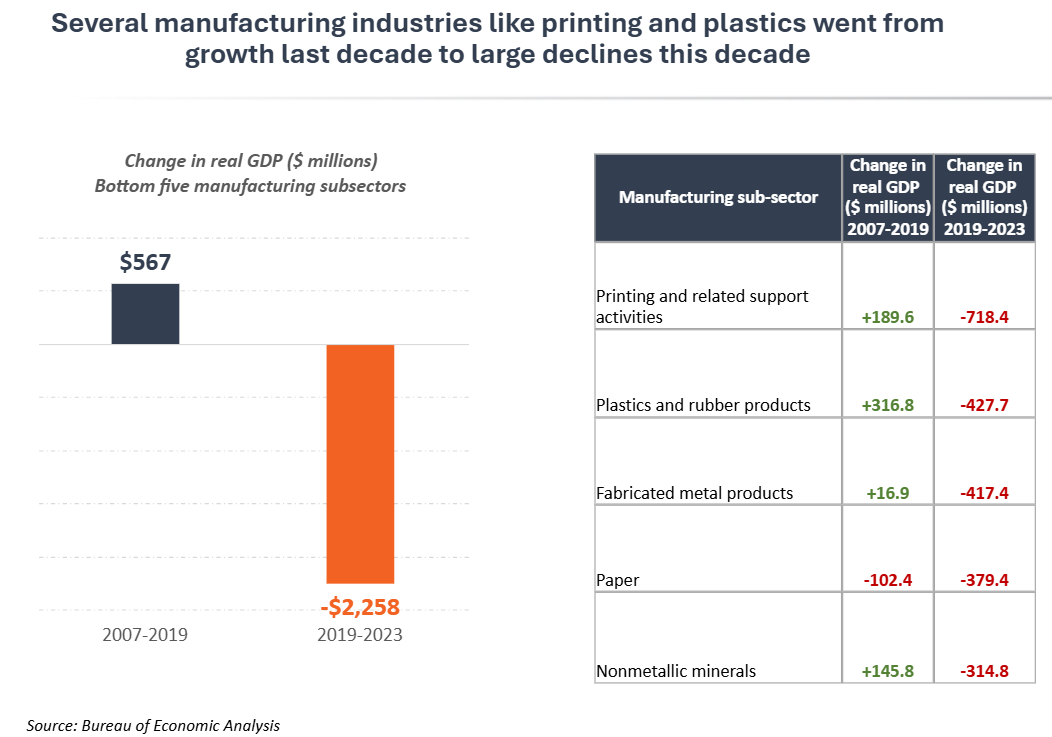Several manufacturing subsectors, such as printing, plastics and fabricated metal products faced substantial declines this decade, after posting positive net gains in the last business cycle. Within Minnesota’s broad manufacturing sector, five subsectors account for nearly three-quarters of total losses in output since 2019. These subsectors – printing, plastic and rubber products, fabricated metal products, paper and nonmetallic mineral products – make up important parts of Minnesota’s manufacturing sector and are often essential links in the supply chains for other manufacturing and industrial businesses. For example, Minnesota businesses that produce machinery, transportation equipment and medical devices all rely on local machine shops, plastic fabrication, sheet metal and stamping businesses to supply parts for finished products. Creating conditions for growth across Minnesota’s diverse manufacturing base, which includes companies who make finished goods and suppliers to those businesses, will be important to ensure success for the whole sector in coming years.