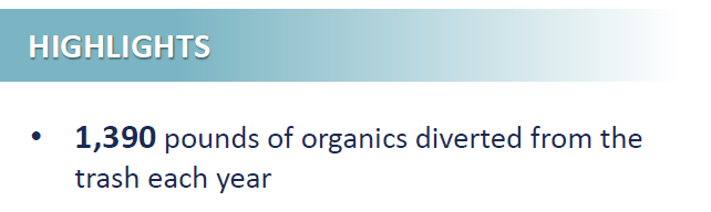 The café replaced disposable plastic cups, lids, paper cups, plastic forks, and plastic spoons with compostable products. They also began composting their coffee grounds and food scraps from the bakery and smoothies. Since implementing organics recycling in their shop, they are now composting 54 gallons of organic material per week, or 1,390 pounds per year!