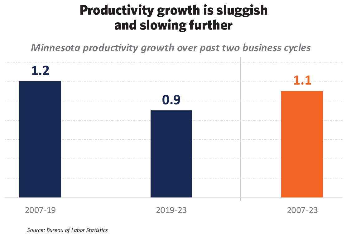 - From 2007 to 2019, Minnesota’s labor productivity grew at just 1.2% annually – well below the U.S. long-run average. Since 2019, labor productivity growth has slowed further to just 0.9% per year, with Minnesota falling to 31st in the nation.