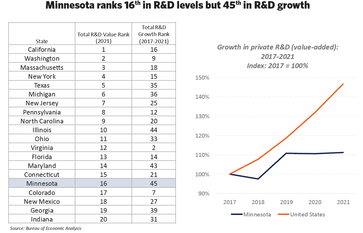 - The same pattern holds for research and development. Minnesota ranks 16th in R&D output but just 45th in R&D growth between 2016 and 2021. Likewise, research from the State Science & Technology Institute (SSTI) shows that R&D spending in Minnesota grew 48th fastest among states from 2013-2022.