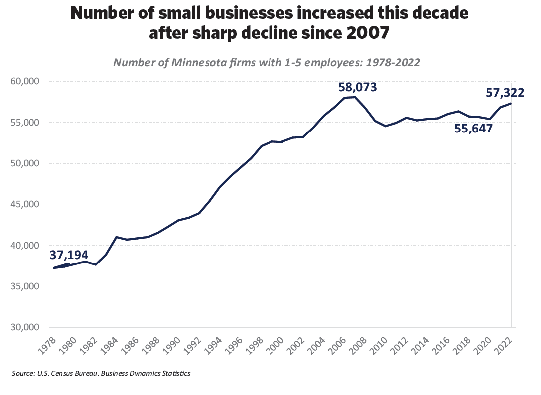 Minnesota should advance a grassroots approach to productivity, enabling a broader base of businesses to innovate, invest and grow. While individual success stories are important, overall productivity grows when tens of thousands of businesses start new ventures, invent new products, automate processes, upskill talent, adopt new technologies, invest in equipment and scale their operations. Minnesota continues to have some of the most innovative businesses in the world. Yet, total patents are declining, R&D is lagging and small businesses are growing at a slower rate than most other states. Policymakers, economic developers, universities and business leaders should seek ways to reduce barriers for businesses of all kinds to innovate and grow.