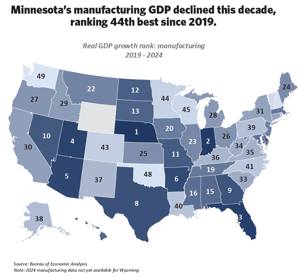 - Minnesota has ranked in the bottom third of states for real GDP growth in these high output per employee sectors, ranking 44th in manufacturing and professional services from 2019 to 2024.