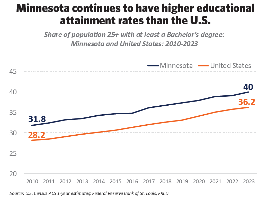 - Minnesota continues to have a highly educated and skilled workforce. Educational attainment rates in Minnesota remain well-above the national average – with the state having the 6th highest share of adults with at least a high school diploma and the 12th highest share of adults with a bachelor’s degree or higher.