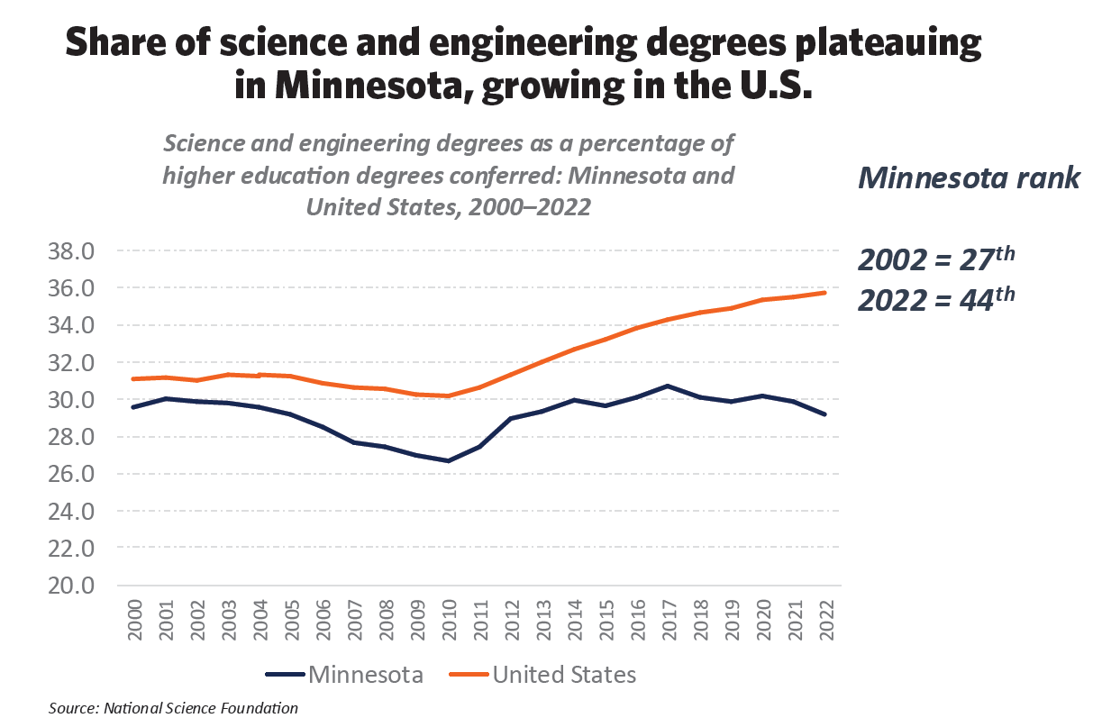 - Similar concerns exist at the post-secondary level. For example, data from the National Science Foundation show that the share of Minnesota higher education degrees awarded in science and engineering fields has plateaued over the past decade and declined since 2017, even as national shares continue to rise.