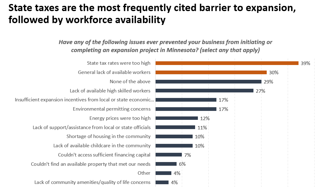 - Survey respondents ranked Minnesota’s high state tax rates and lack of available workers as the top two barriers that prevented businesses from expanding in Minnesota. Businesses and site selectors described that overall business climate and hiring issues have led some companies to expand outside of Minnesota in recent years.