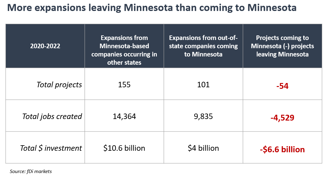 - Data from fDi Markets shows that Minnesota-based companies are expanding in other states at a higher rate than out-of-state companies are expanding in Minnesota. Since 2020, Minnesota had a net investment deficit of 54 projects, 2,500 jobs and $6.6 billion in capital expenditures.