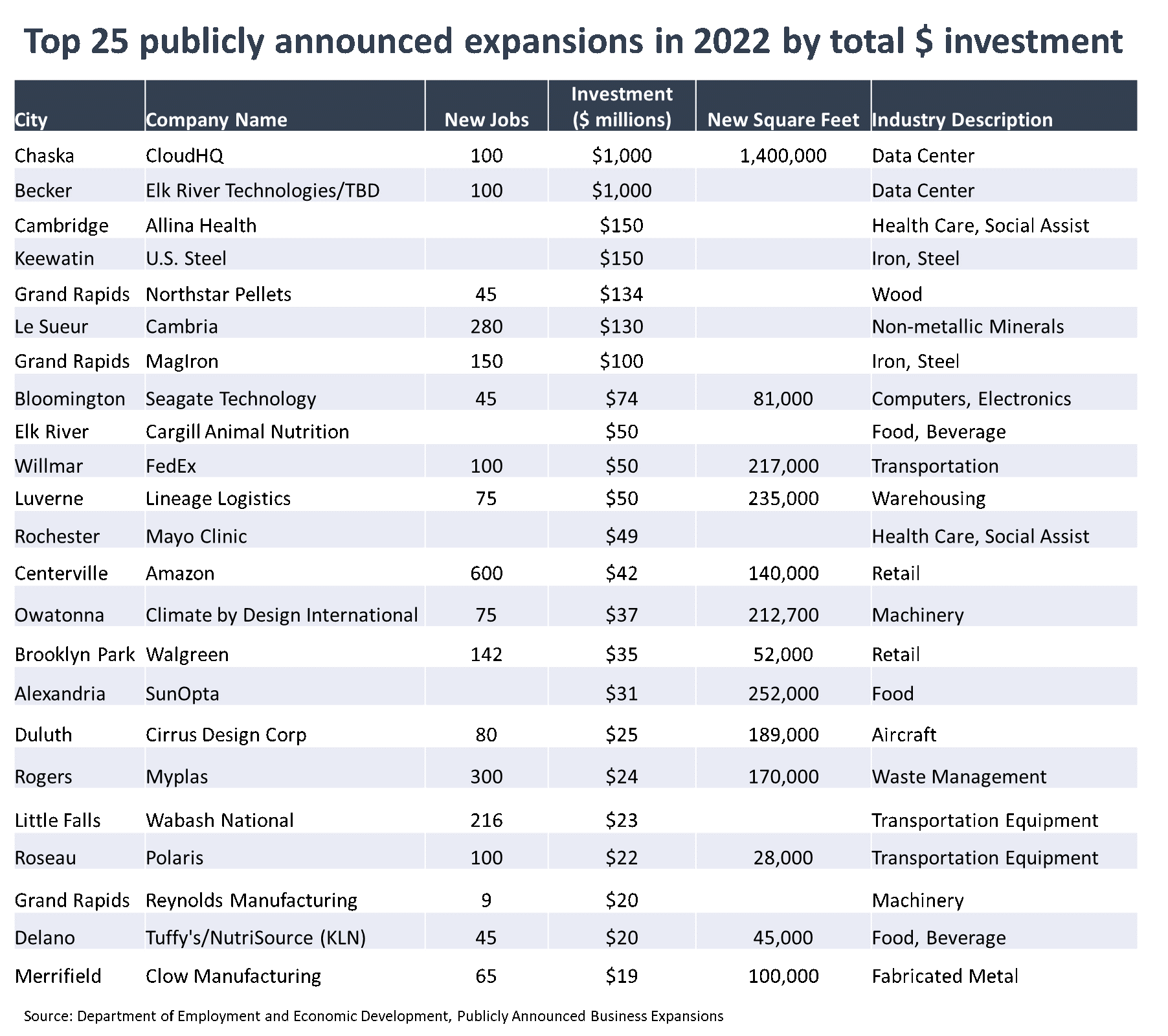 - Minnesota’s largest business expansion announcements in 2022 spanned a wide range of industries and communities around the state. Two data center projects, each expected to be around $1 billion, take top billing as the largest investment announcements last year. Each quarter, the Department of Employment and Economic Development (DEED) rounds up a list of publicly announced business expansions in the state. The list does not include all expansion projects in the state, as businesses are not required to publicly release information on expansion activities. However, it offers critical information on which businesses are expanding, how much they expect to invest, and how many jobs may be created through those activities. In 2022, DEED listed 134 projects that together would add 5,854 new jobs and invest $3.8 billion in the state. A review of the 25 largest projects shows that companies are investing in new expansions across a wide range of industries and communities, from a $150 million investment in advanced mining operations in Northeast Minnesota to a $50 million warehousing project in Southwest Minnesota to a $74 million high tech manufacturing and office project in the Twin Cities. The two largest expansion announcements, as measured by total capital investments, were two data center projects, each expecting to invest $1 billion and create 100 new direct jobs.