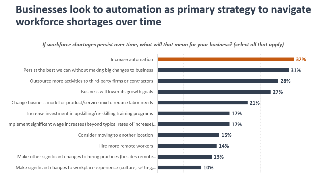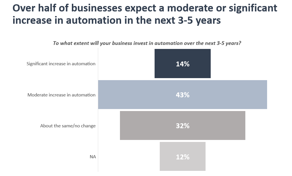 - Fifty-seven percent (57%) of survey respondents expect automation to increase moderately or significantly in the next 1—3 years, and a plurality (32%) indicated that they would look to increase automation if they continue to face workforce shortages over time.