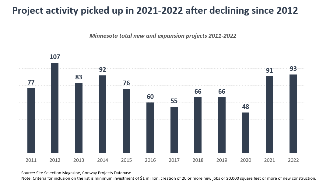 - Total project activity in Minnesota picked up in 2021 and 2022 after falling steadily since 2012. Minnesota received 107 new and expansion projects in 2012. Activity dropped off in the following years, however, and averaged just 65 new and expansion projects in the last five years of the decade. Project levels ebbed slightly throughout the U.S. in the late part of the decade as well, but the drop-off was steeper in Minnesota than the national average.