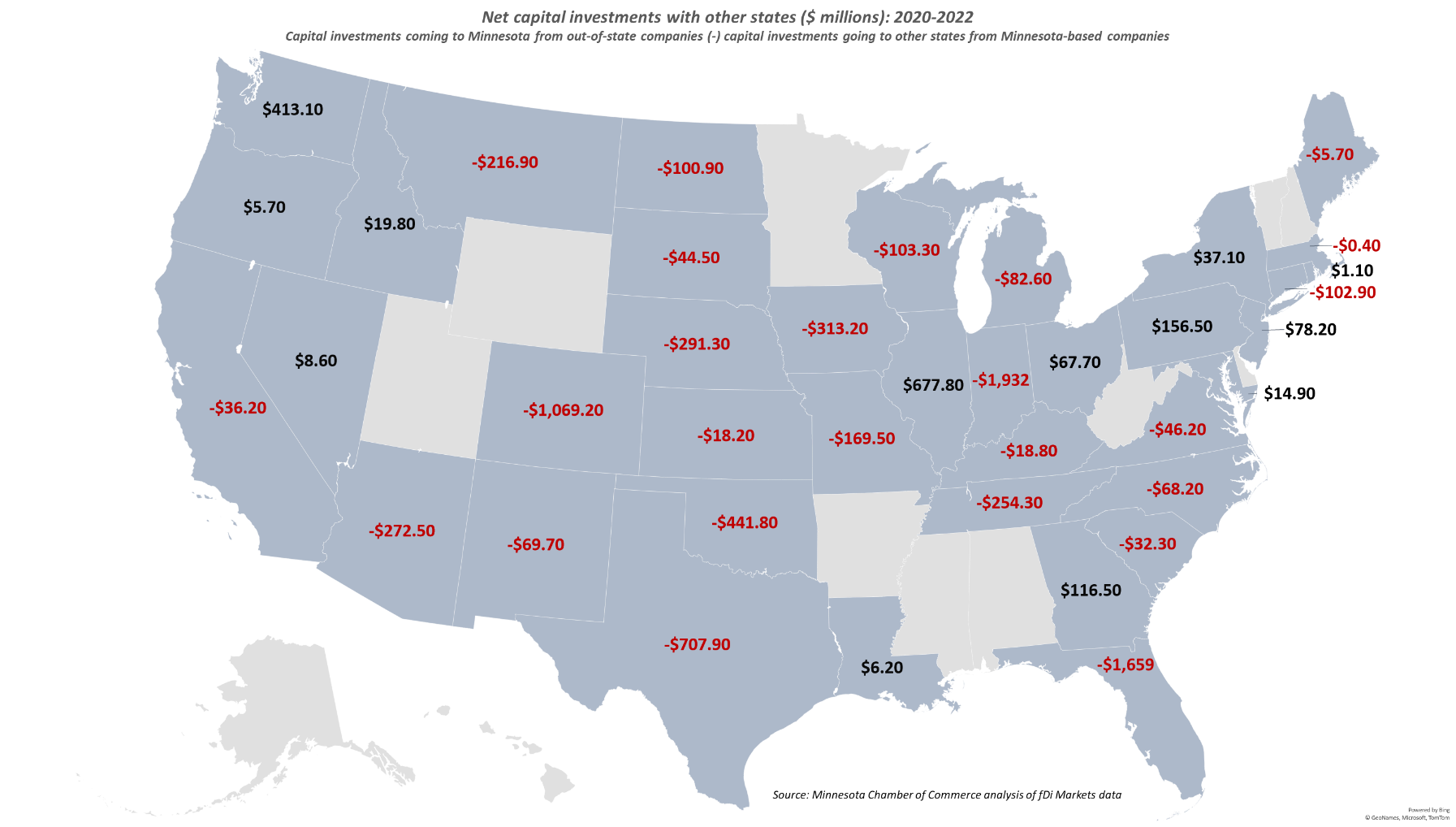 - Minnesota companies are investing most heavily in Florida, Indiana, Colorado and Texas, with those states receiving $4.6 billion in capital investments from Minnesota companies from 2020—2022. Additionally, Minnesota had a net investment deficit with each of its neighboring states so far this decade, with Minnesota-based companies investing $562 million more in neighboring states than companies from those states invested in Minnesota projects.