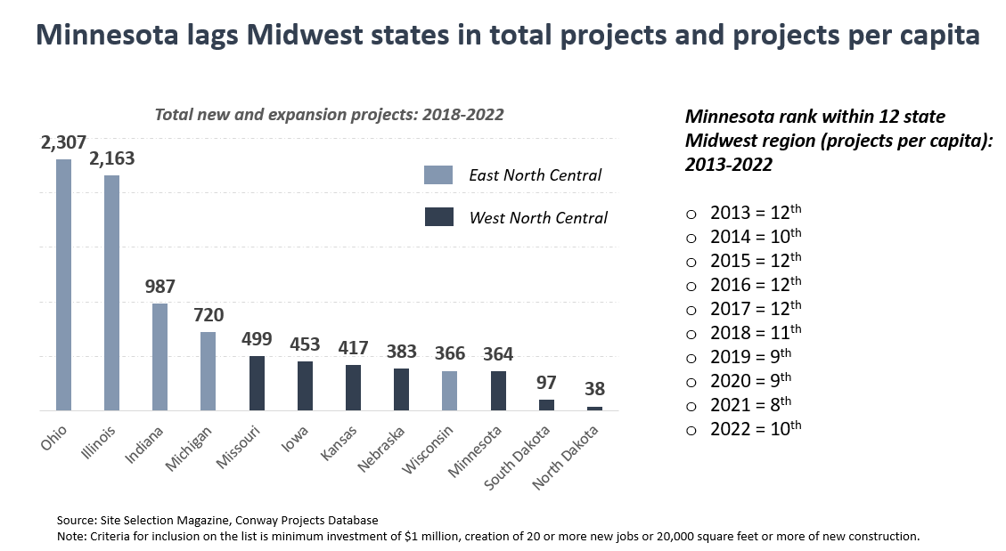 - While overall activity ticked up in Minnesota since 2021, the state consistently ranks near the bottom of Midwest states for new and expansion projects. Minnesota ranked 10th out of 12 states in the region in total projects from 2018 to 2022, and ranked 10th in projects per capita in 2022.