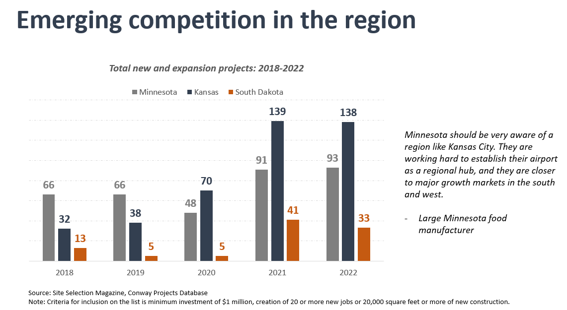 - South Dakota and Kansas are small but emerging markets within Minnesota’s competitive landscape. While states to Minnesota’s east – such as Ohio, Illinois and Indiana – make up a lion’s share of projects in the Midwest, smaller states in the western part of the region have shown emerging growth in recent years. For example, South Dakota and Kansas increased expansion activity significantly in the first two years of the decade, with Kansas receiving the most projects per capita in the U.S. and attracting large-scale investments in that time. South Dakota was one of only three midwestern states with positive net domestic migration since 2020 and was the most frequently cited state by respondents of the Grow Minnesota!® business expansion survey as an attractive place to locate or expand. These states have much smaller populations and labor pools, but their emerging presence should be noted as states in the region compete for business investments in coming years.