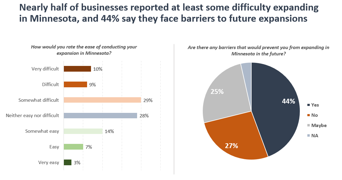 Indeed, twice as many respondents (48%) rated their ability to expand in Minnesota as somewhat difficult to very difficult, compared to the 24% that said it was somewhat easy to very easy. Respondents gave Minnesota an average rating of 4.7 out of 10 points (with 10 being the best) as an attractive place to expand compared to other states. And 44% of respondents reported that they face barriers to expanding in Minnesota in coming years.