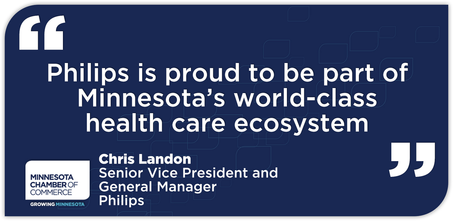 “Philips is proud to be part of Minnesota’s world-class health care ecosystem,” says Landon. When considering what benefits there are to doing business in Minnesota, he says, “Being part of this community helps with innovation, talent attraction and collaboration with academic medical centers and universities.” In 2020, Philips opened an “innovation lab” across the street from the Mayo Clinic in Rochester.