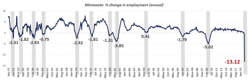 The 2020 recession caused by the COVID-19 pandemic rippled across the global economy with unprecedented speed and severity. Minnesota reported its first case of the novel coronavirus on March 6. Within weeks, the state experienced a statewide lockdown, and by the end of April – a mere seven weeks after the first reported case – Minnesota had lost over 13% of its total employment and nearly 614,000 Minnesotans filed claims for unemployment insurance, marking the steepest economic downturn in over 70 years.