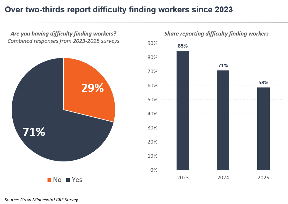 Manufacturers report workforce availability and skills gaps as a top barrier to their growth in the state. In addition to job vacancy data, other surveys and interviews with manufacturing leaders show that workforce availability has become a primary challenge for employers’ ability to grow and expand in the state. Since 2023, the Grow Minnesota! program surveyed over 150 manufacturers through its annual State of Business Retention and Expansion report. Over seventy percent of manufacturers surveyed since 2023 reported difficulty finding workers. Similarly, Enterprise Minnesota’s 2025 poll of over 400 manufacturers found that 80% of firms say it is somewhat or very difficult to attract qualified talent.