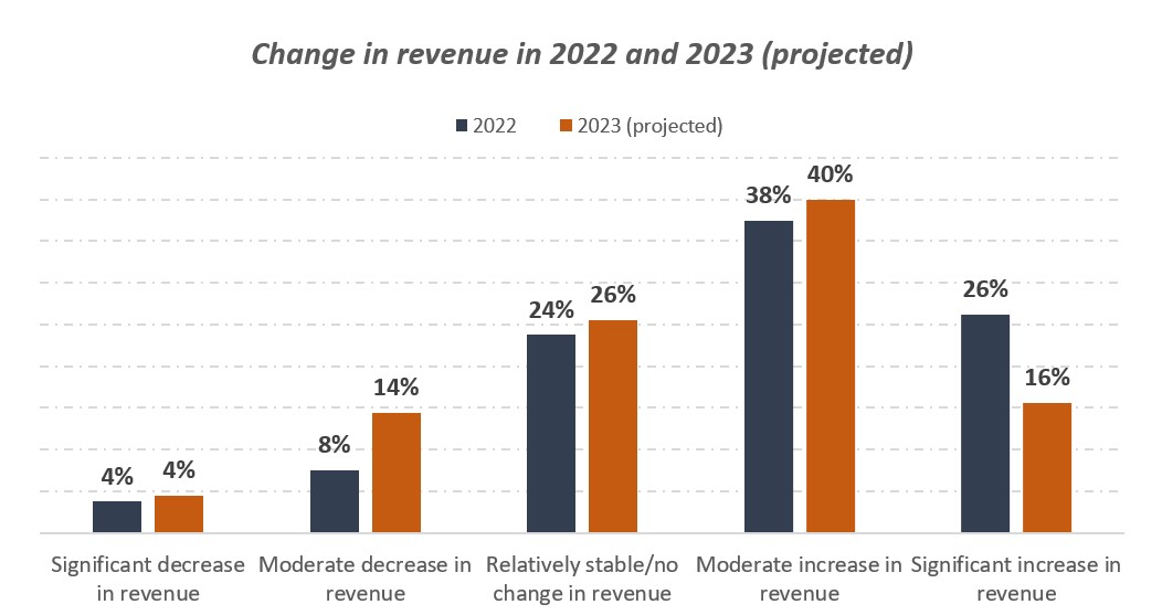 - A majority of businesses surveyed are still expecting revenue gains in 2023, though fewer expect significant gains and nearly twice as many are expecting moderated decreases in 2023 than in 2022 (see chart below).