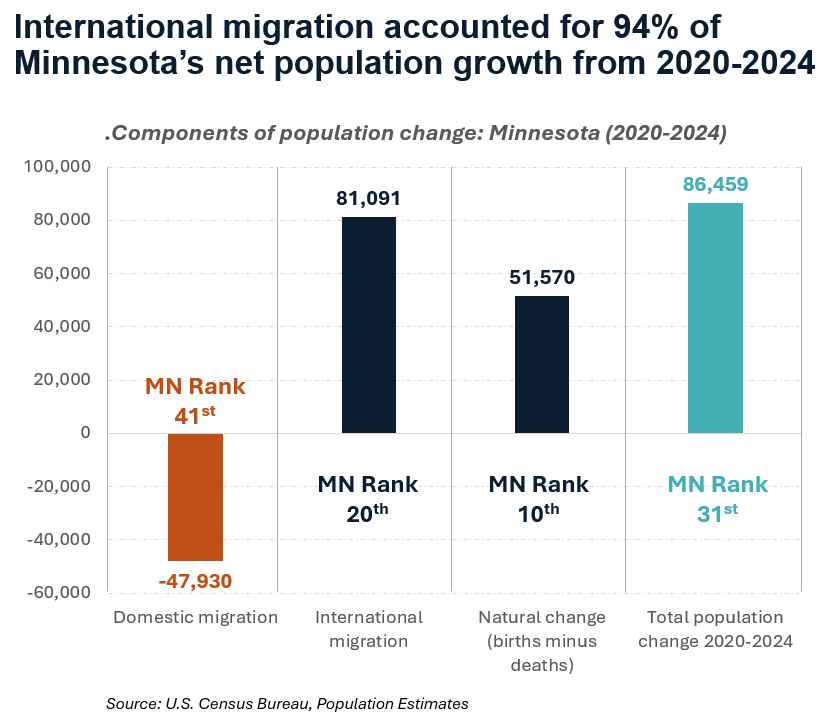 Minnesota ranks 41st in GDP growth, 40th in labor force growth and 37th in job growth so far this decade. Immigration remains one of the key levers to improve the state’s economic outlook going forward.