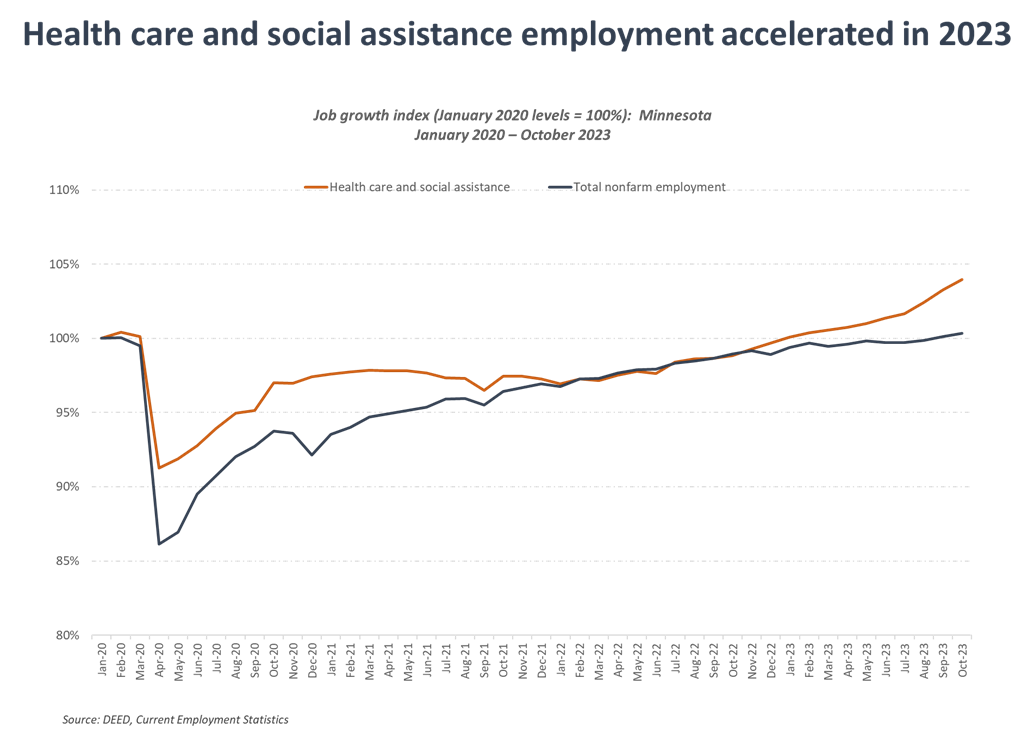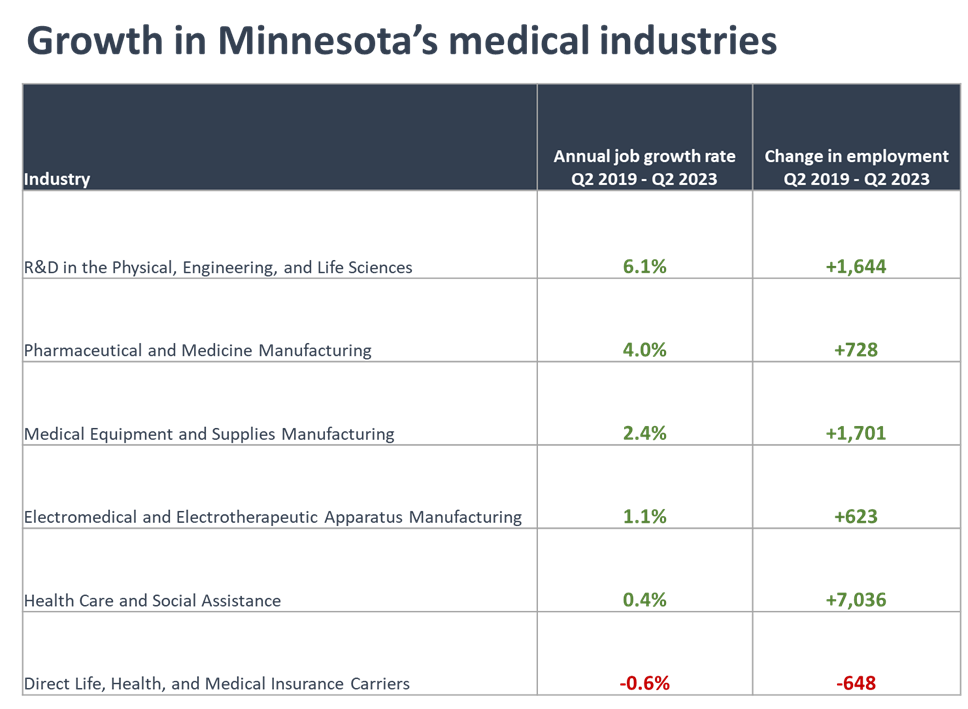 - Despite notable challenges and volatility, Minnesota’s medical sector grew in the first part of the decade. Total employment grew from Q2 2019 to Q2 2023 across all segments of the sector, except for health insurance carriers which fell by 0.6%. The state’s health care and social assistance industry added over 7,000 jobs in that time. Biopharma and med-tech industries also expanded jobs, adding nearly 5,300 jobs since mid-2019. Current Employment Statistics data – which is released monthly and offers a more recent snapshot – shows that Minnesota’s health care and social assistance saw particularly strong performance in the middle part of 2023. The industry was the largest contributor to job growth in the state through October 2023, expanding by 3.9% and adding 19,000 jobs since January on a seasonally adjusted basis.