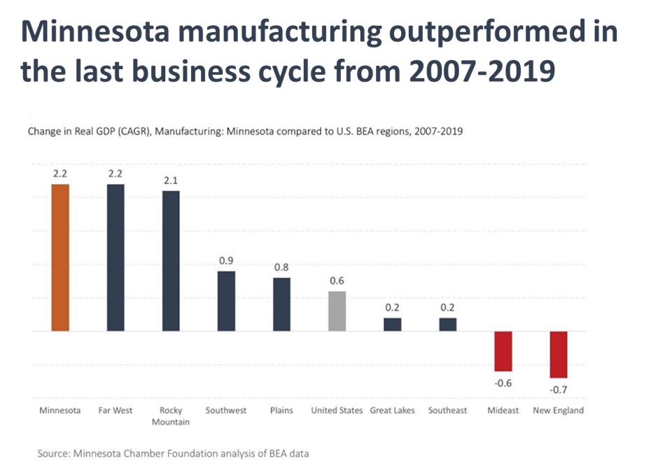 Heading into the new decade, Minnesota’s manufacturing sector was poised to continue its outperformance of other midwestern states. Minnesota has a diverse manufacturing sector with strengths in high value-added industries like computers and electronics, medical goods, machinery, building products and transportation equipment. This favorable profile of industries, along with a skilled manufacturing workforce, enabled Minnesota to lead the region in manufacturing GDP growth over the previous business cycle from 2007-2019.