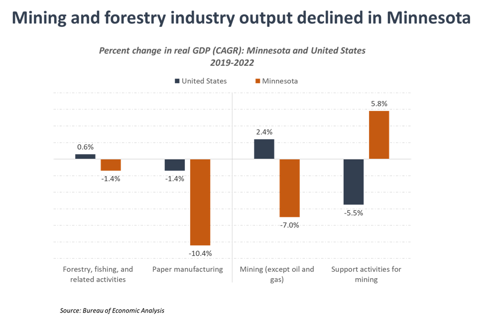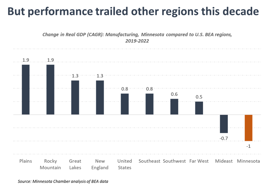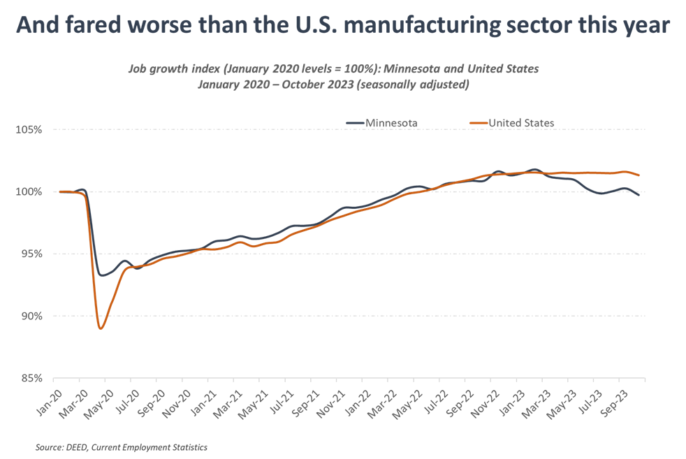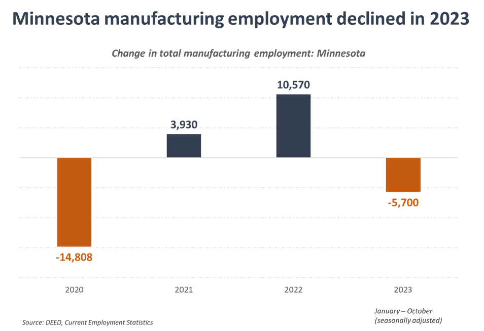 After outperforming the U.S. manufacturing sector from 2007-2019, Minnesota manufacturing ranked last in the Midwest and 40th nationally in real GDP growth from 2019-2022. The sector faced further setbacks in 2023, shedding 5,700 jobs from January to October and performing worse than the U.S. manufacturing sector.