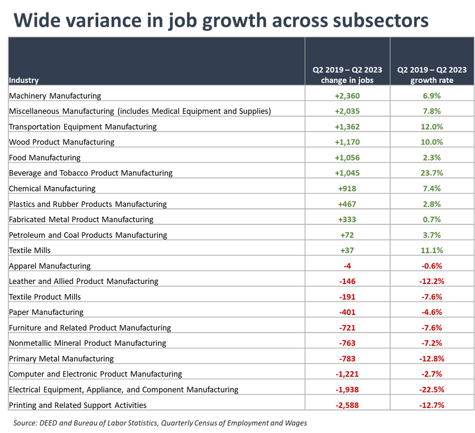 Bright spots in Minnesota’s manufacturing sector include transportation equipment, machinery, wood products, food processing and medical goods. Despite challenges overall in the sector, Minnesota gained headway in several key industries this decade. Machinery manufacturing led the way, adding 2,360 jobs from the middle of 2019 to the middle of 2023. Other growth industries include miscellaneous manufacturing (which includes medical equipment and supplies), transportation equipment (including snowmobiles), wood products (including doors and windows) and food and beverage manufacturing. All of these reflect some of Minnesota’s core industry cluster strengths and demonstrate continued competitive advantages in these activities. At the other end of the spectrum, however, were losses in other key manufacturing subsectors like printing, electrical equipment, and computer and electronics, which together shed over 5,700 jobs in that time.