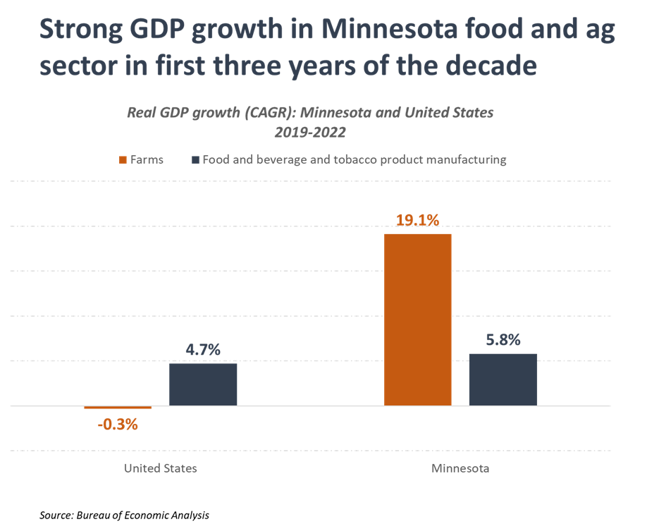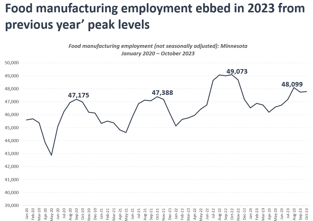 Minnesota’s food and agriculture industries expanded in the first years of the decade. The state’s farm output grew by a rapid 19.1% annually from 2019-2022, standing in stark contrast to the national farm sector which contracted by -0.3% in that time. Likewise, Minnesota’s food and beverage manufacturing industries outpaced the U.S., growing by 5.8% annually since 2019 (Detailed GDP data on state farm and food manufacturing for 2023 is not yet available at the time of this publication). Employment in Minnesota’s food manufacturing industry also grew from 2020-2022 but ebbed slightly in 2023.