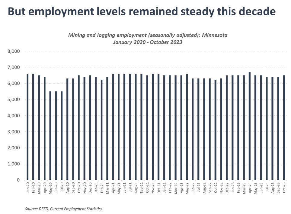 Mining and forestry products experienced declining output but steady employment levels in recent years. Real GDP declined by an average annual rate of -7.0% in Minnesota’s mining sector from 2019-2022 and by -1.7% in its forestry, fishing and related activities industry. Both industries fared worse than the U.S. average in that time. However, despite declining output, overall employment levels in the state’s mining and logging industries remained steady since the beginning of the decade. Minnesota entered 2020 with 6,600 direct jobs in mining and logging, and by October 2023 that number remained nearly unchanged at 6,500 jobs (on a seasonally adjusted basis). While more detailed GDP data won’t be available until 2024, quarterly data on the Mining, quarrying, oil and gas extraction (which for Minnesota is heavily dominated by mining activities) show a positive growth rate of 5.8% in the first two quarters of 2023.
