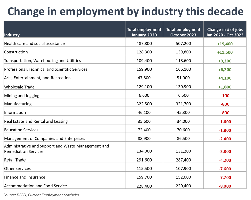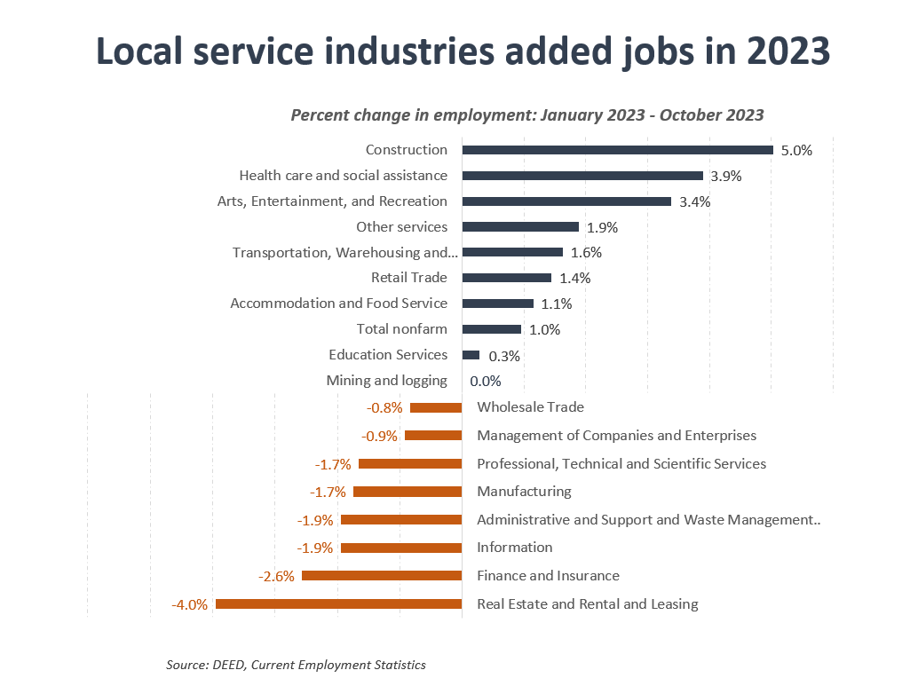 Locally oriented industries like construction, health care, and arts/entertainment/recreation led job growth in Minnesota’s economy in 2023, while tradable industries like manufacturing and business services lost employment this year.