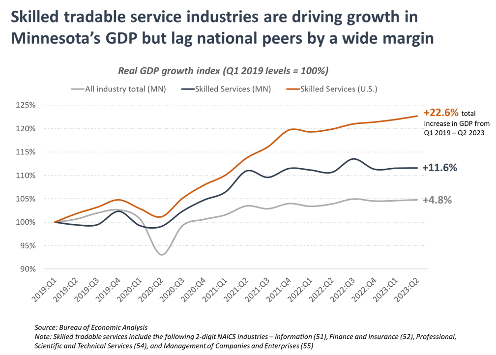 Tech and business service sectors are driving GDP growth in the state and national economy. However, Minnesota continues to lag the U.S. in these industries, helping explain the state’s overall below-average economic growth in recent years. Real GDP in skilled tradable service industries grew by a total of 22.6% in the U.S. compared to just 11.6% in Minnesota from Q1 2019 to Q2 2023.
