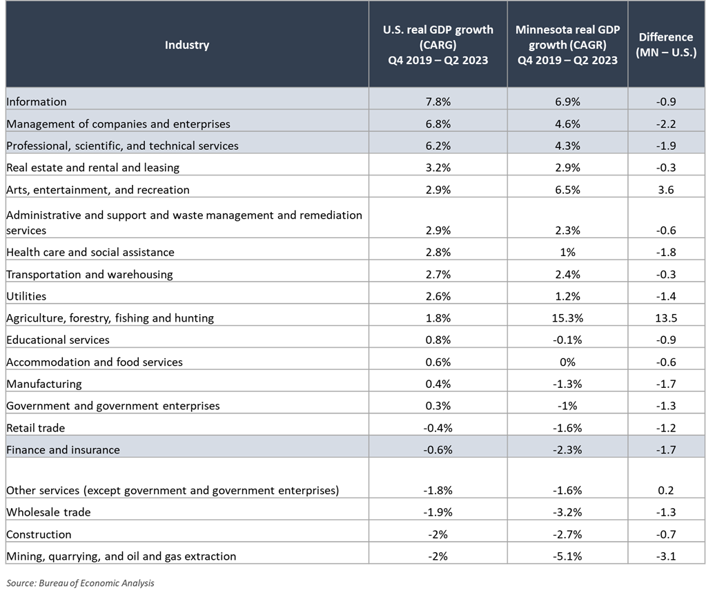 State GDP data show a similar trend for Minnesota in 2023, as local service sectors outperformed sectors with tradable goods and services, although with some exceptions.