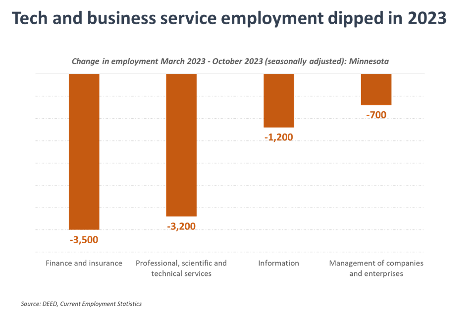 Overall activity in skilled tradable industries cooled in 2023 after strong growth in 2021-22. After strong growth during the recovery from the Pandemic-Recession, tech and business service industries cooled in the past year, with employment declining through much of 2023. This was seen most clearly in Minnesota’s professional, scientific and technical services industry, which had among the fastest job growth in 2021 and 2022 but shed -3,200 jobs since March 2023.