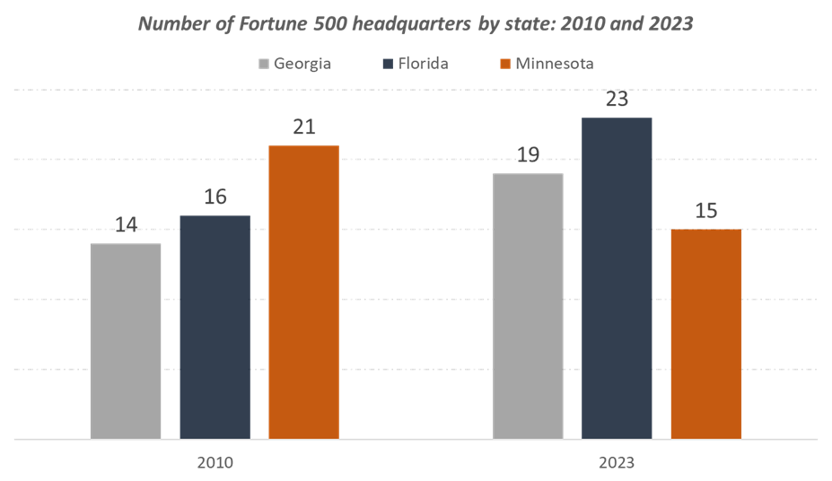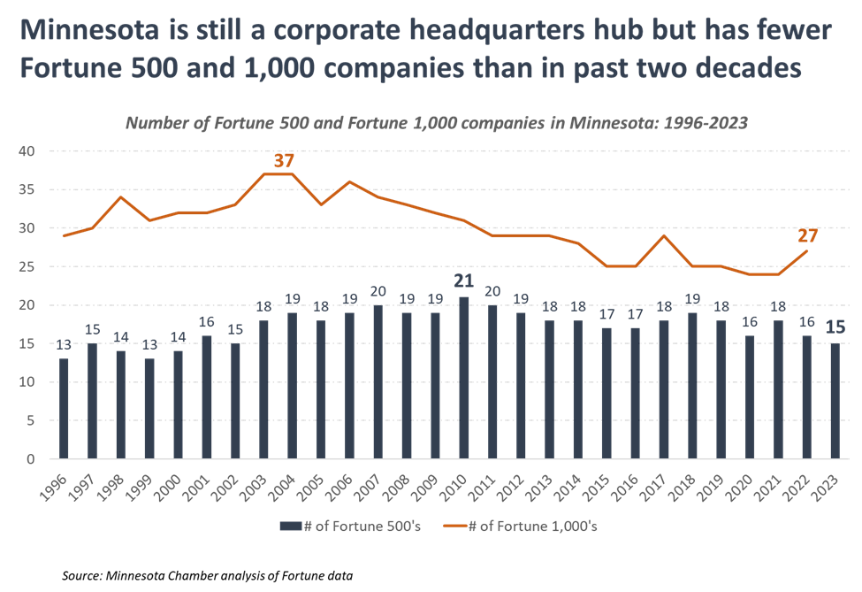 At the same time, the number of Minnesota companies listed on Fortune 500 and Fortune 1,000 – which ranks the largest U.S. companies by annual revenue – has dwindled over the past decade. At its peak, Minnesota had 21 companies on the Fortune 500 list. By 2023, that number fell to just 15.