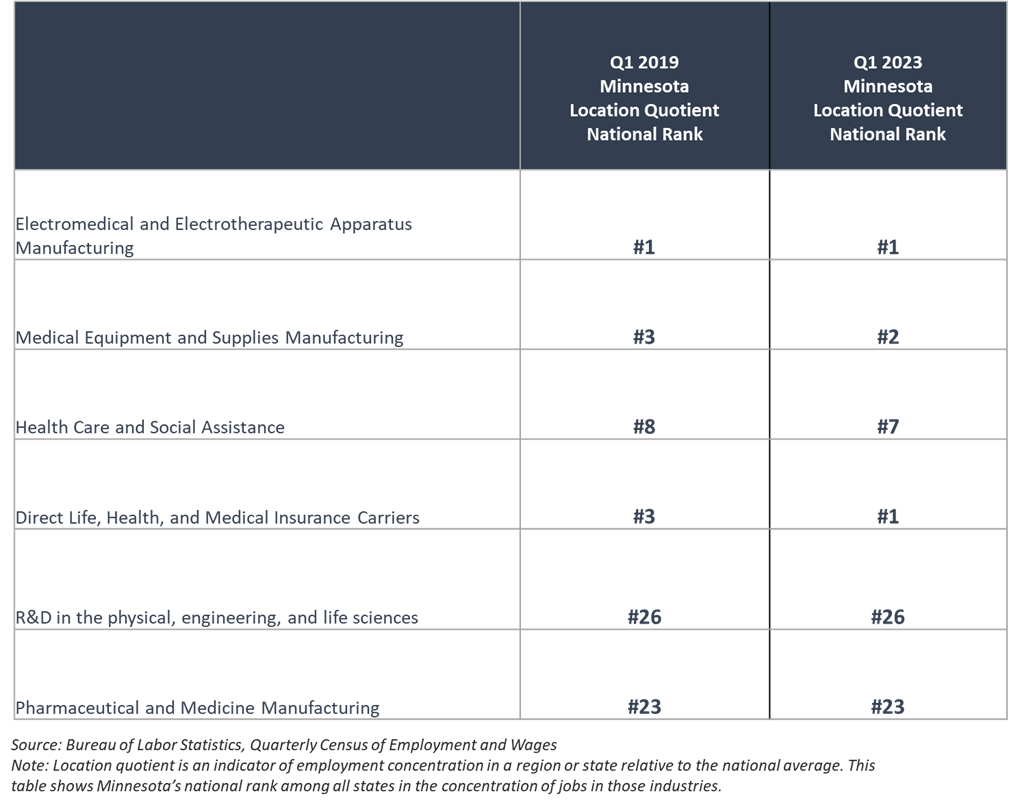 Minnesota built on its competitive advantages in health care and medical technology so far this decade, demonstrated by growth in employment, strong investments in startups and facility expansions, and increasing market share in sector employment nationally.