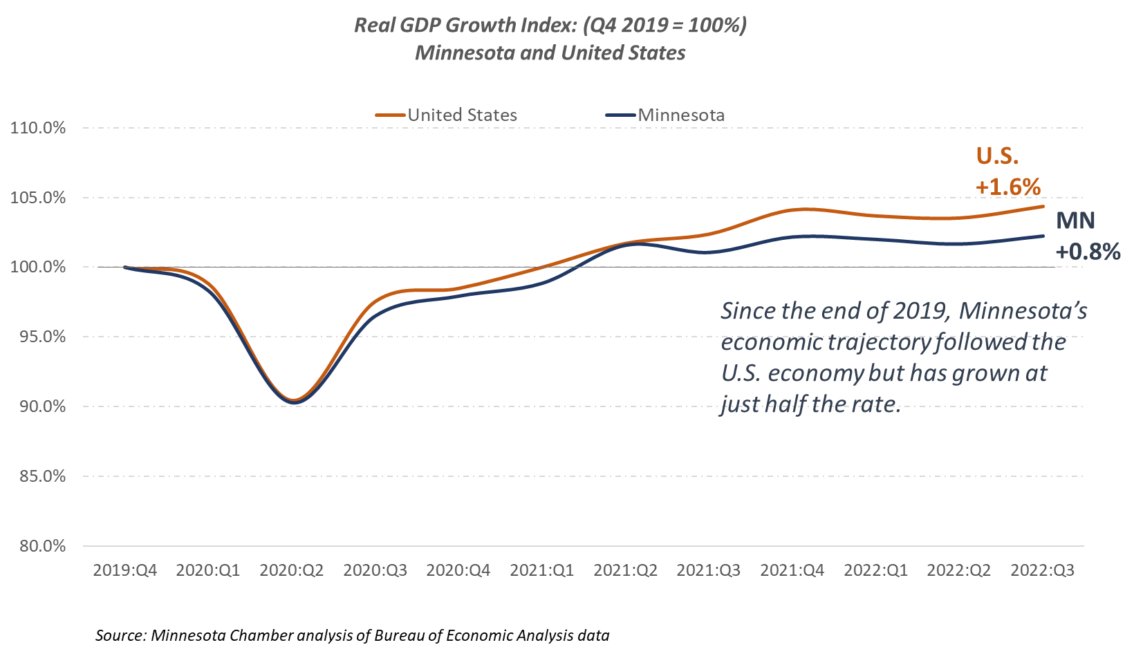 - Minnesota continues to lag the U.S. economy. The state’s real GDP grew by 0.8% an average annual basis from the pre-pandemic peak (Q4 2019) to Q3 2022, ranking 33rd among all states, and trailing the U.S. growth rate of 1.6% in that time.