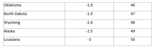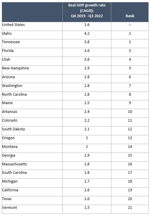- GDP growth varied widely across states over the past two years. States in the sunbelt and mountain west grew fastest, while states in the midwest and northeast regions lagged. Idaho expanded fastest since the end of 2019, increasing real GDP by 4.2% on an average annual basis. Louisiana trailed all states with a -3.0% decline in real GDP in that time.