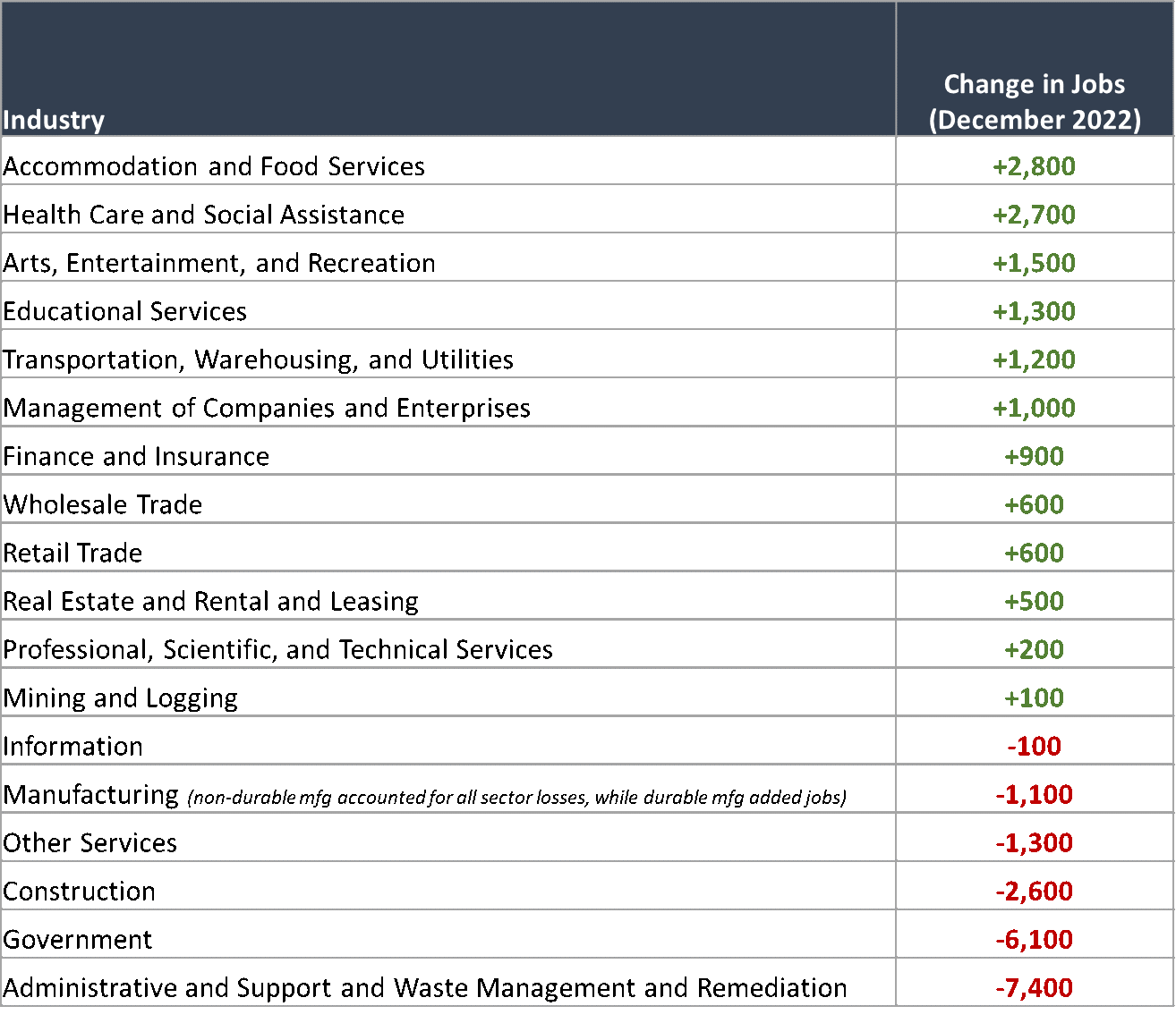 - The recent decline in total employment is a warning sign, but it may mask other areas of continued strength in the labor market. First, job losses were concentrated in just a handful of industries, including areas like local government, temporary employment/staffing agencies, construction, and food manufacturing. Many sectors continued to add jobs in December, led by Leisure and Hospitality and Education and Health Care. Other notable industries important to Minnesota’s economy, such as the management of companies and enterprises industry (which includes corporate headquarters locations), also added jobs in December. In total, private sector employers added 900 jobs in December, while government shed 6,100 jobs.