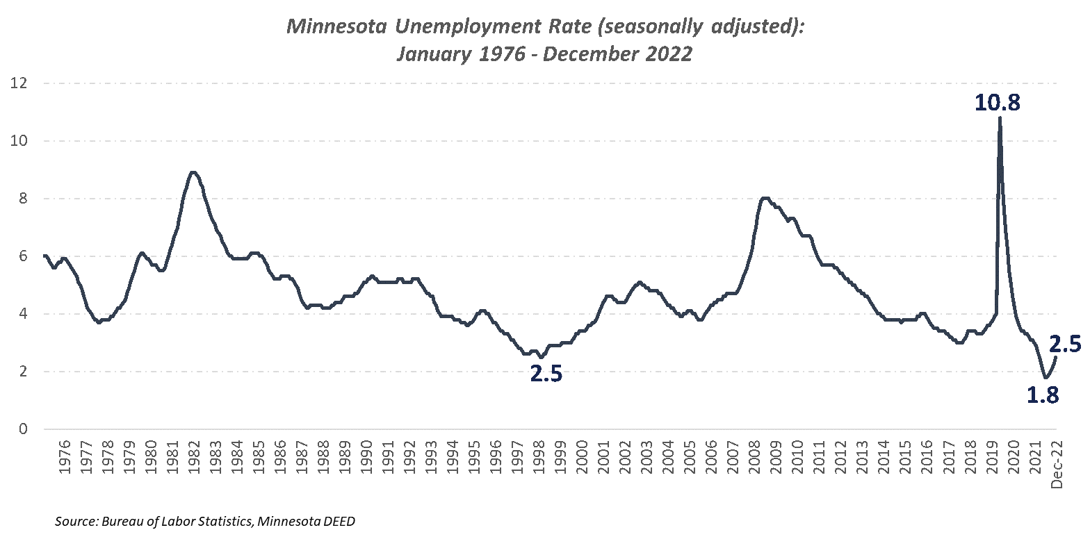 - Unemployment rose through the second half of 2022, ticking up to 2.5% in December from an all-time low of 1.8% in July. Despite the recent uptick, however, Minnesota’s unemployment remains very low by historical standards, matching the previous all-time low of 2.5% set in 1999.