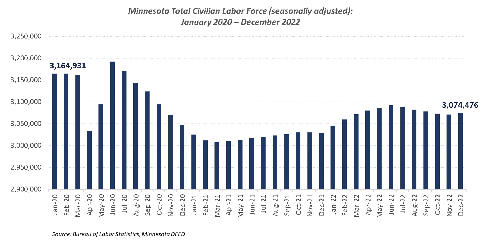 - After increasing in the first half of 2022, Minnesota’s total available labor force declined by 6,721 in the fourth quarter. As of December, Minnesota had 90,000 fewer people in the workforce than at the beginning of 2020. Drivers of Minnesota’s decline in available workers include falling labor force participation (i.e. the share of adults 16 and older that are actively working or looking for work) and negative net migration.