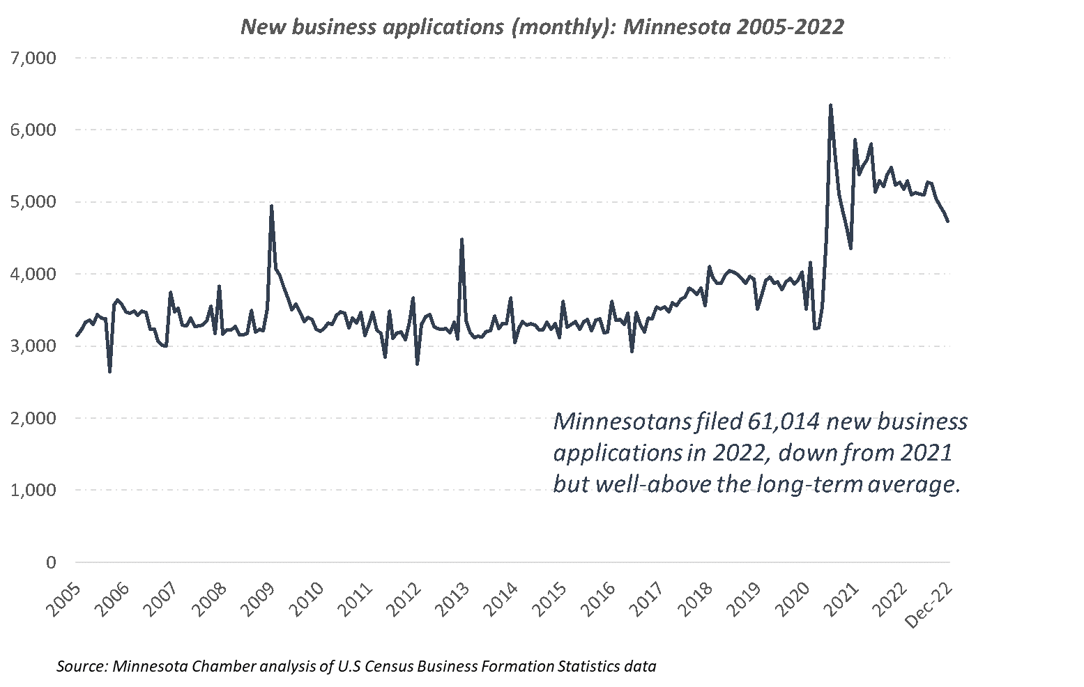 - New business filings in Minnesota slowed in the fourth quarter, dropping below 5,000 new monthly applications for the first time since December of 2020. However, new business applications remained well above the long-term average. From 2005-2019, Minnesotans filed an average of 3,440 new applications each month. Applications spiked in the second half of 2020, as disruptions from the COVID-19 pandemic spurred both need-based and opportunity-based entrepreneurship. Minnesotans filed an average of over 5,400 new business applications each month in 2021 and filed an average of 4,800 in 2022.