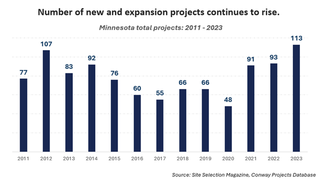 - Interest rates and inflation placed a burden on investments, causing some companies to delay expansion until the cost of borrowing decreases. Larger economic conditions are stifling growth; however, expansion data reveals an underlying demand for growth. In 2023, Minnesota had at least 113 expansion projects, up from 93 in 2022. Furthermore, investments into Minnesota from out-of-state companies increased to $2.5 billion in capital expenditures and 4,353 jobs created. Minnesota secured large investments across a range of industries including healthcare and medical technology, food and agriculture, data centers and advanced manufacturing.