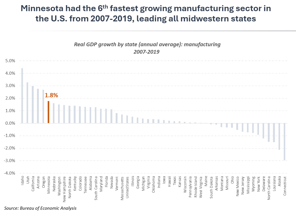 Manufacturing was a competitive bright spot for Minnesota in the first two decades of the century, with Minnesota outpacing the U.S. manufacturing sector and ranking 6th in GDP growth nationally from 2007-2019. While Minnesota’s overall economic growth consistently lagged the U.S. economy for much of this century, the opposite has been true for Minnesota’s manufacturing sector. From 2000-2019, Minnesota’s manufacturing GDP grew 2.4% annually, compared to just 1.6% in the U.S manufacturing sector. During the 2007-2019 business cycle, Minnesota ranked 6th among states in manufacturing GDP growth and ranked 1st among all states in the Midwest region.