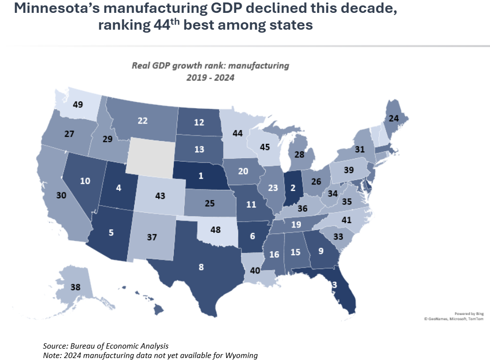 However, momentum has faltered in the first half of the current decade. Both manufacturing GDP and jobs have declined, and Minnesota now ranks 44th among states in manufacturing growth. This downturn has been a key factor in the state’s recent economic underperformance, with Minnesota falling into the lower third of states on several major growth indicators.